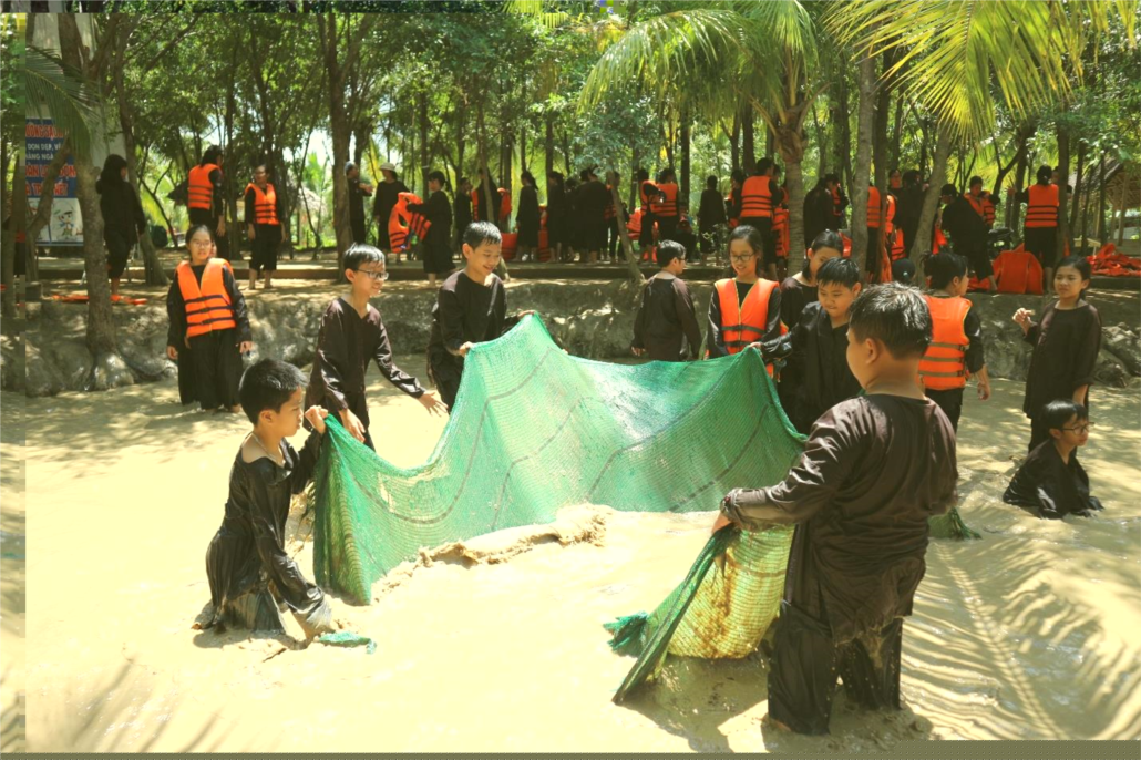 Đến Khu du lịch Lan Vương, các em học sinh được trải nghiệm những hoạt động, tham gia những trò chơi thú vị như: đua thuyền ba lá, đi dây văng, đi cầu dừa, bắt cá,…Trải nghiệm cảm giác làm nông dân với những bộ bà ba nâu xinh xắn.