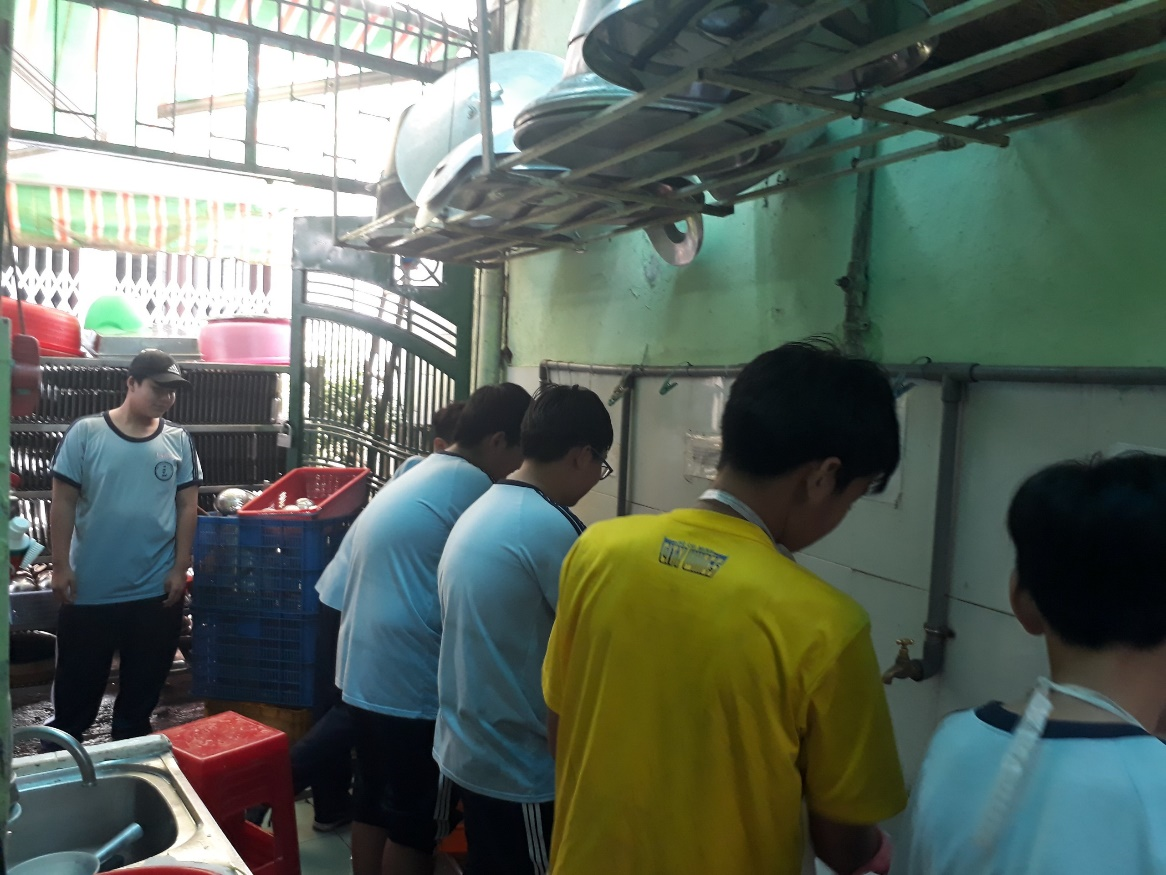 em học sinh hỗ trợ rửa bát đĩa và trông xe